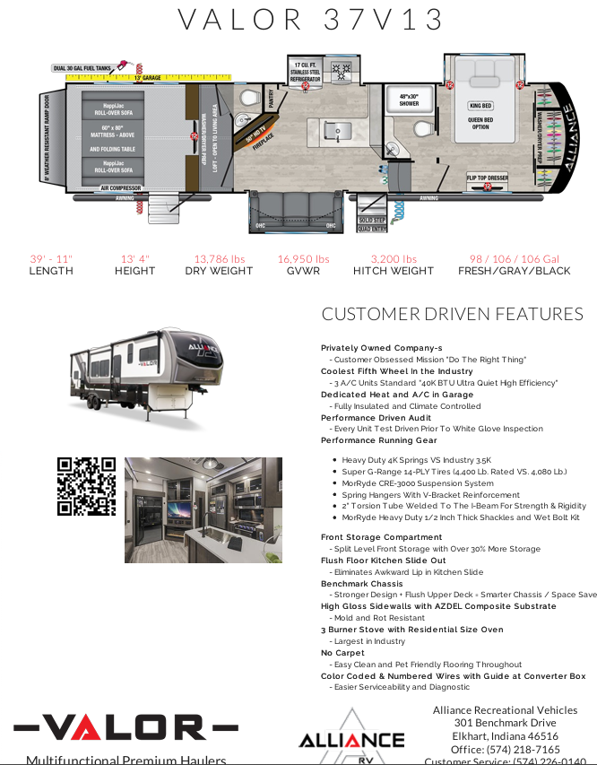 This 5th wheeler toy hauler is the perfect boondocking RV that will allow you to completely disconnect from the world, reach the deepest wilderness and bring your toys with you. With large capacity tanks (fresh, grey, black, Gasoline, LP) and full solar capacity (330 watts. Runs one AC) you will be able to go away and stay away longer.