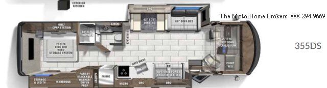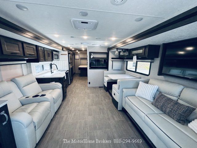 Model 355DS with a full-wall slide-out on the passenger side and an addition slide-out in the living and galley that creates a huge living space for this 36 foot coach. Built on a Ford F53 Chassis with the new powerful Ford V-8, 7.3L engine rated @350 HP, Torqshift 6 speed auto transmission, 7,453 low miles, auto leveling, 5.5 KW generator, 1200 watt inverter, 50 amp service, frame-less tinted windows, fiberglass roof, power patio awning, slide topper awnings, new upgraded super quiet A/C units, rear ladder, 8,000 lb. hitch, exterior 40 inch LED TV and generous basement storage.