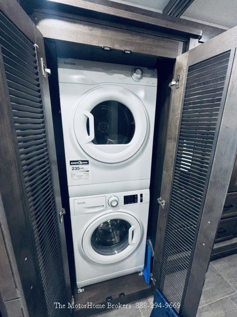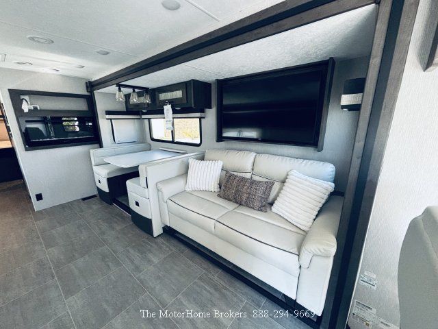 The bright and airy interior features a hide-a bed sofa with opposing power theater seating, a large LED TV with auto satellite system for your entertainment, electric fireplace, vinyl flooring throughout for easier cleaning, drivers area with full instrumentation including rear/side view monitoring, R/H chrome mirrors, 10 inch touch screen radio with Bluetooth Apple CarPlay and Android Auto Link enabled, power shades, co-pilot work station and a drop-down overhead bunk for extra guest when needed. This layout offers a nice galley with solid surface countertops, nice cabinetry, a large farm sink with high faucet, 3 burner LP cooktop, convection microwave, residential refrigerator, pantry and a large Dream dinette. Moving to rear is a fully enclosed private bathroom with oversized shower, vanity sink, medicine cabinet, porcelain toilet, linen closet, stacked washer and dryer. The master bedroom has a king bed with massive storage underneath, a 3 door wardrobe, many storage drawers, TV and so much more.