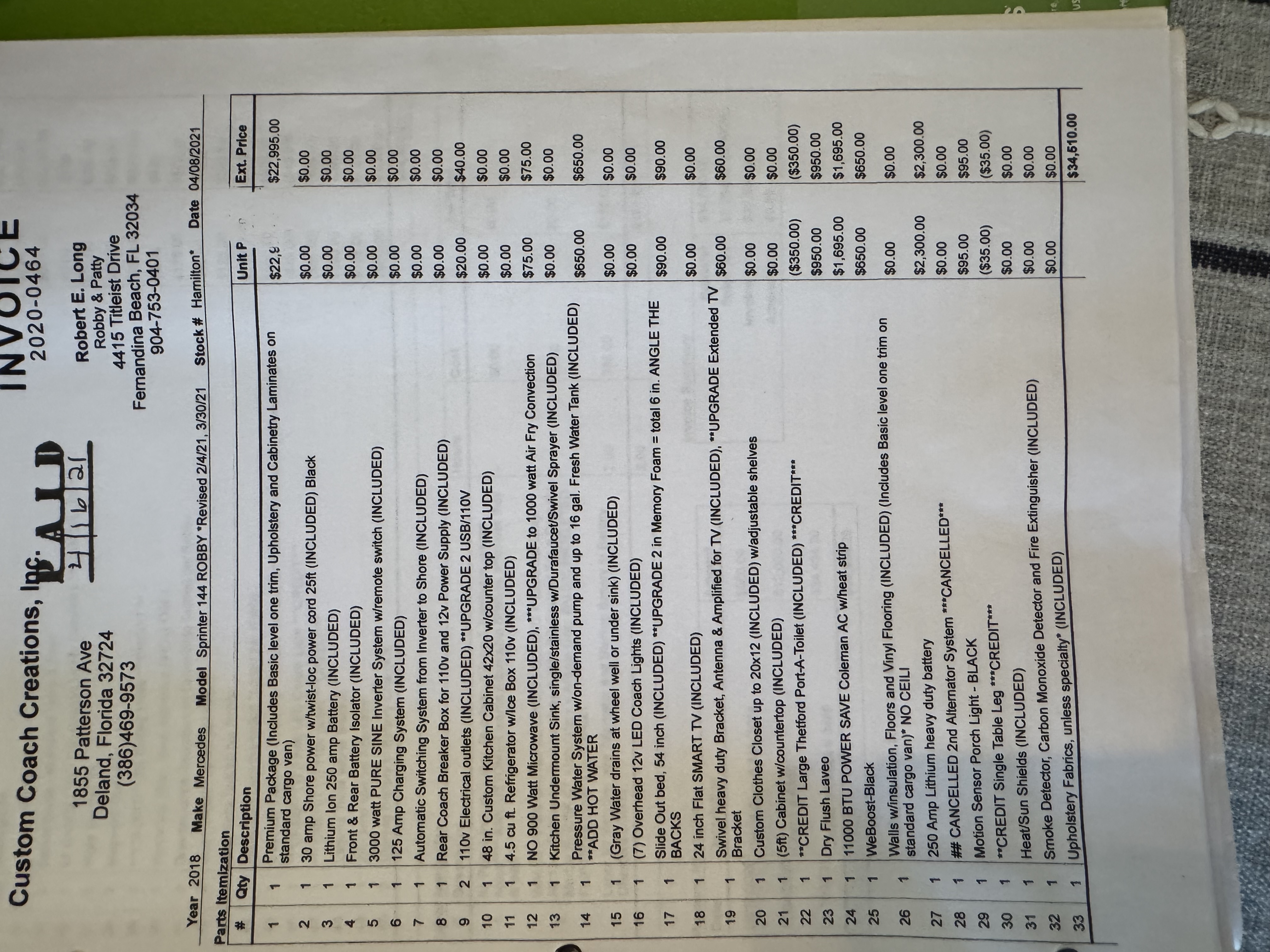 The customization package was done by the company called 'Custom Coach Creations, Inc. 1855 Patterson Ave. Deland Florida, 32724. Ph: (386) 469-9573. They have been incredibly helpful as well, and willing to help all future owners with any maintenance advice. The customization package is worth $36,934.00